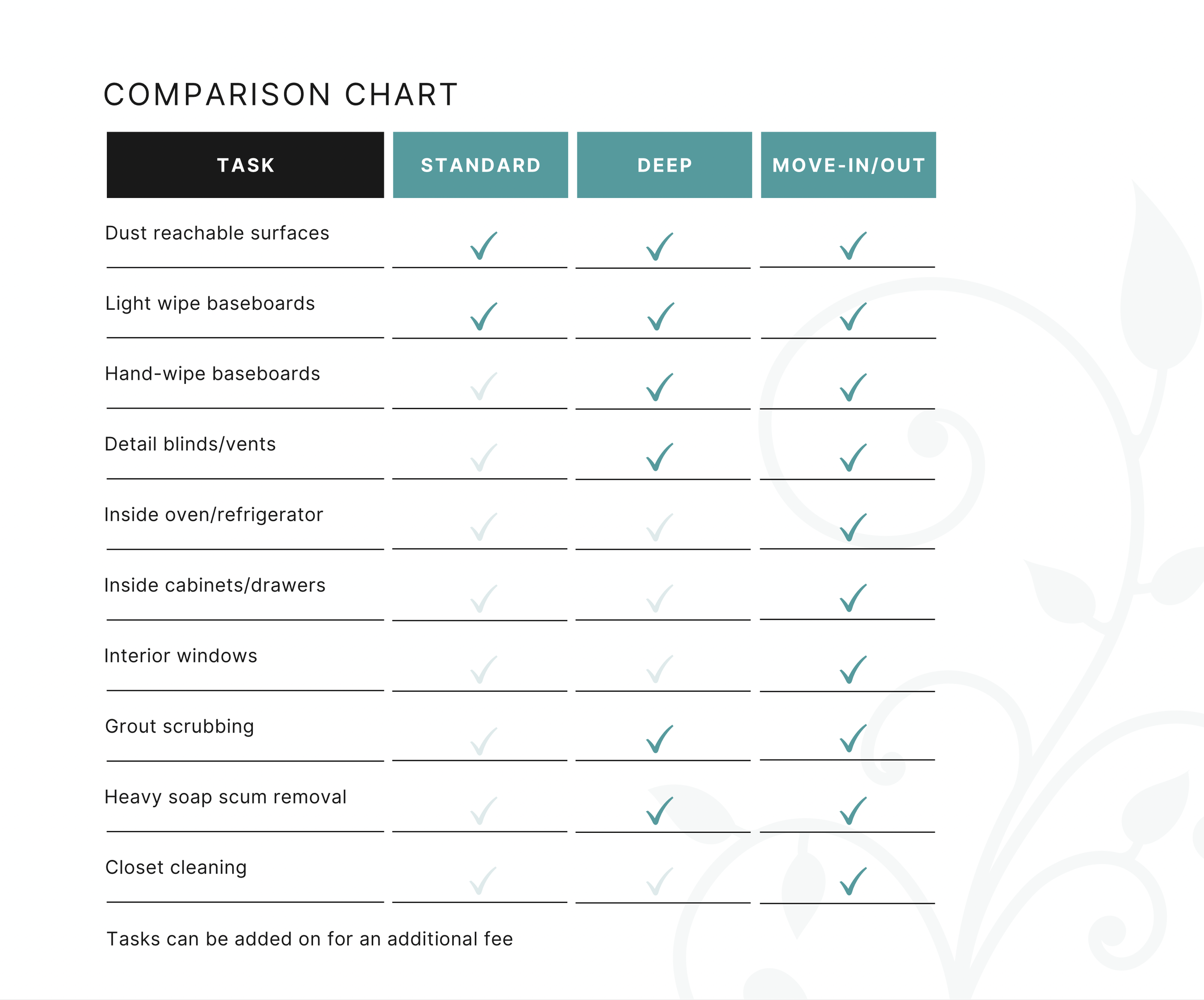 Our Standard Clean is perfect for maintaining a fresh, tidy home on a regular basis. This service covers all the essential cleaning tasks to keep your space looking its best week after week.
